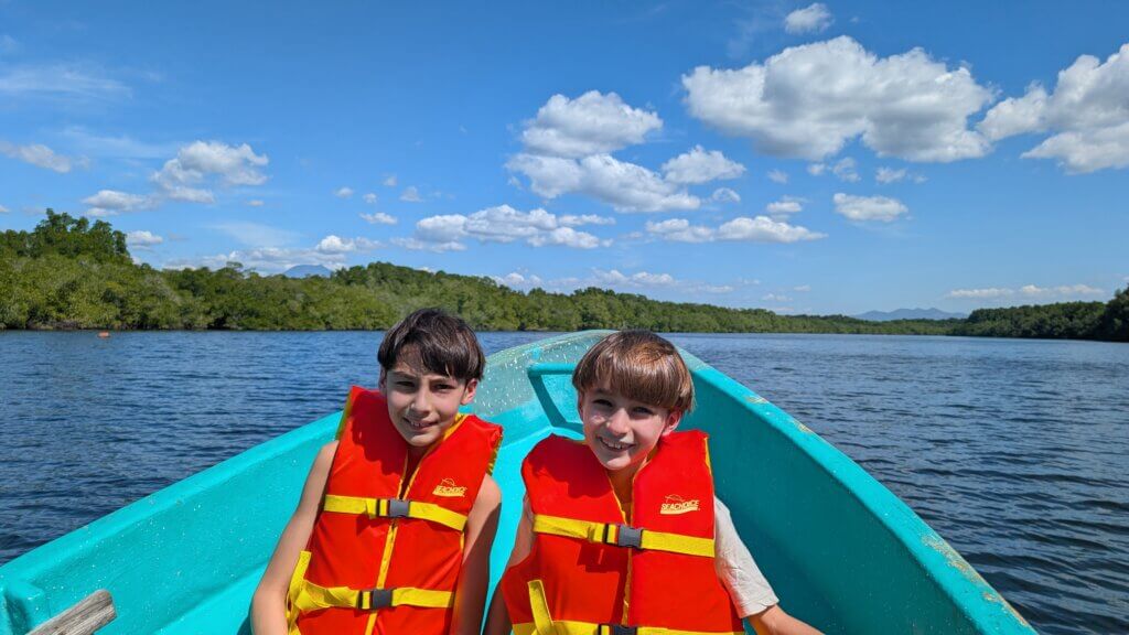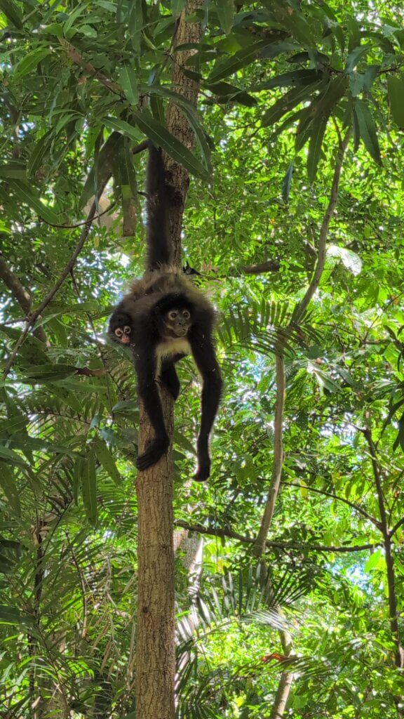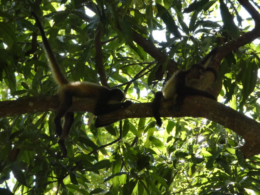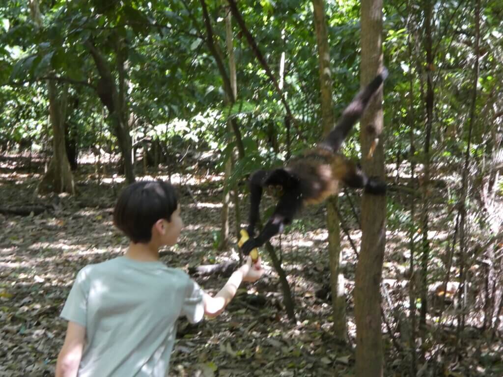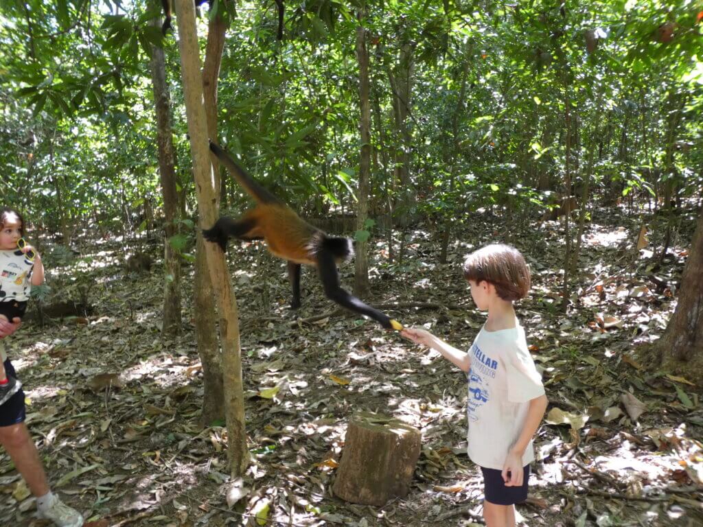 We started the day bright and early with the sun pouring into our room. We left Las Tres Piedras by 8 am and drove almost 3 hours to Puerto Barilla. The first activity was a twenty minute walk in the jungle where we were able to see spider monkeys in the wild and feed them plantains. The monkeys were eager for food and seemed trained to gather around the tourists. It was very cool seeing a monkey carry her baby on her back and watching the monkeys swing from tree to tree. The kids also enjoyed feeding the monkeys and watching them in their natural habitat. After the walk back, we ate our lunch and changed into our bathing suits for the afternoon.