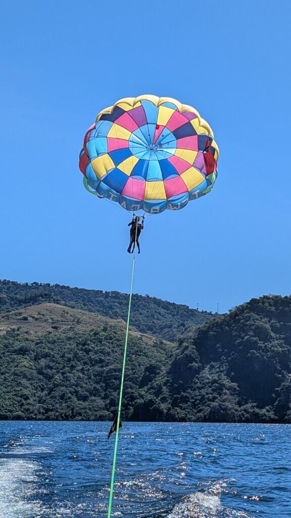 After a lot of driving Thursday, we were looking forward to spending time locally near Tres Piedras. We originally planned to use ATV/buggies to head down to the lake, but after one of the buggies malfunctioned, we changed our plans and went in the van. Once we got to Lake Ilopango, we were greeted by stunning volcanic views and an authentic Salvadoran beach. It was mostly rocky with some sandy close to the water. Locals brought their lunches with them and were laying on makeshift hammocks. Our guide told us that most water activities are only offered on Saturdays and Sundays, so we did whatever was available. We took another lancha out to the middle of the lake where some of us jumped into the lake. It was a fun and refreshing activity. While we were deciding what to do, Allen saw a few people attempting to parasail. When we got back, he insisted that we look into it. Sam decided to do the activity, but they wouldn’t let Allen go alone or with Sam because of the weight limit. Sooo… once Sam returned, he convinced Rita to go up with Allen. The ride was relaxing and lasted about 10 minutes minutes before the boat driver made a sharp turn and pulled us into the water. I’ve never done parasailing before and it was a cool, thrilling activity. (Although things haven’t been as cheap as we expected (compared to Guatemala) this cost $80 for the 3 of us to do, which was very economical.) We then returned to the hotel and swam in the infinity pool before it was time for Shabbat.