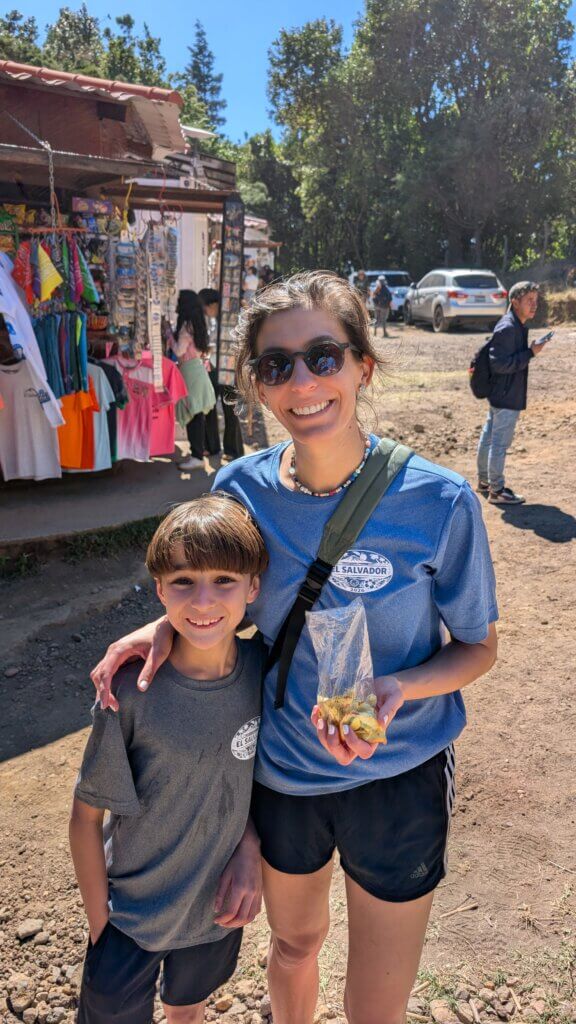 We got off to an early start and successfully left by 7 am to head to Santa Ana Volcano. This was the most discussed activity of the trip – Sam did not want to attempt it with all the kids and was sure that we couldn’t do it. However, all the blogs said that this was a top activity in El Salvador and the rest of the adults didn’t want to miss it. The 4.4 mile hike winds through a covered forest for the beginning portion and then through a rocky, dusty terrain before reaching the top of the volcano. We started the hike at the Casa Cristal location, which supposedly was an easier starting point. We had to purchase tickets and then wait on line to be let into the hike. Supposedly they only send people up in groups. Or maybe it’s because it was a super crowded Sunday. Either way, we were relieved that we made it into the right time. Our friends, the Sayeghs, also met us here for the first time on our trip, and the kids loved hiking together. Thankfully, all the kids cooperated really well and hiked without complaining for the most part. Even Sharon (2) walked for a little, before ultimately being carried by her mom and dad. The beginning part of the hike was generally easy as it was a flat path in a shaded area. After the forest section, the path was filled with rocks and stones and became more complicated. Halfway through the hike, we stopped for ices- a delicious treat after a long, hot walk. As we reached the end of the hike, the wind picked up, making it slightly more difficult. However, the last quarter mile was almost impossible because of the wind and dust flying everywhere. Some of the kids were even scared they would fly away. When we reached the top, almost all of the kids were crying. We thought we would be able to picnic at the top, but that was not going to happen. Luckily the clouds cleared and we were able to see the stunning turquoise water that the Santa Ana volcano is famous for. We were able to get some pictures before beginning the climb down. At this point, everyone was looking forward to less winds in the lower altitudes. On the way down we stopped on the side of the hike to eat lunch. After almost 4 hours (with some breaks) we finished the ascent and descent of the volcano. Our bodies were aching and our faces were dusty, but we did it!! Asher had told us it would be crowded, but we’ve never seen crowds like this in a previous hike. Also, the police were behind our group, making sure that we kept pace, which honestly made it more stressful. At the base of the hike, we found the yummy green mangoes that Rita was dreaming about since Guatemala. What a delicious treat!