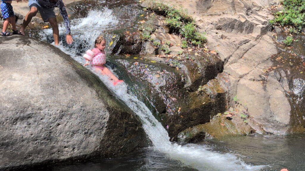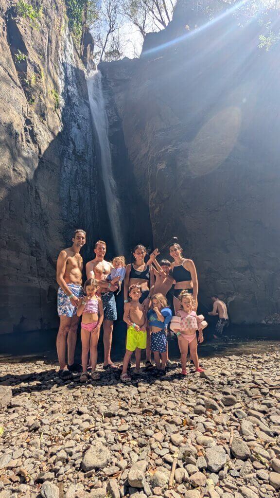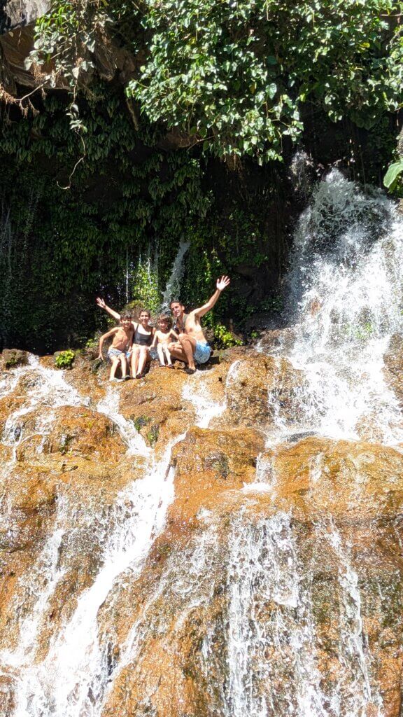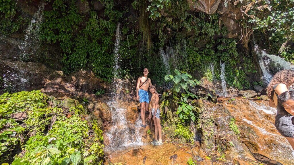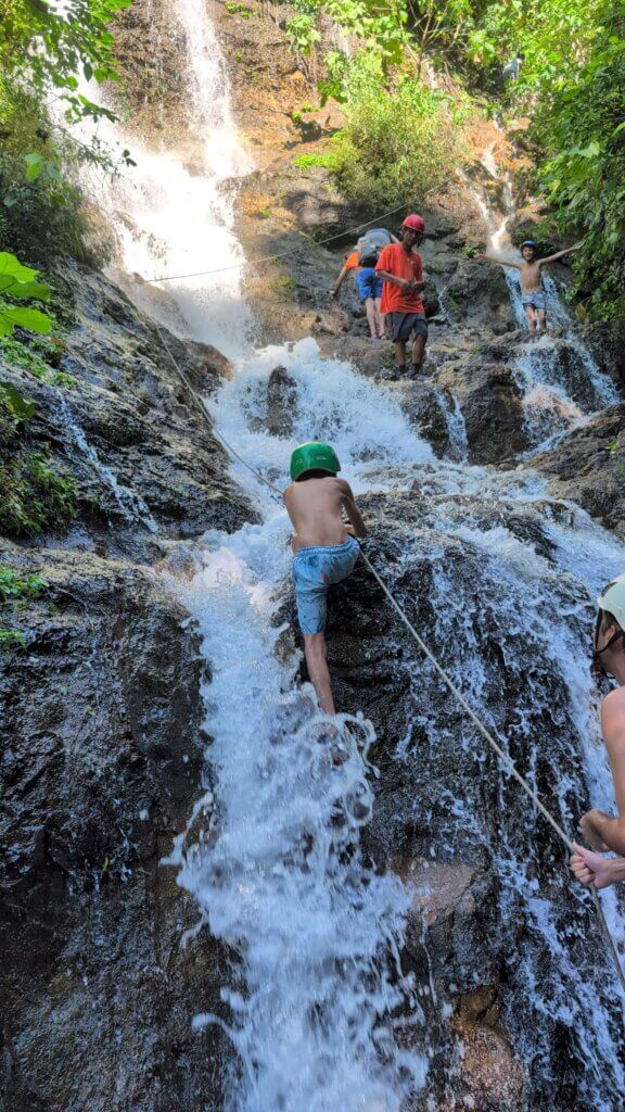 The hike began in a shaded, sandy, rocky area. Some points were very steep and narrow and we took extra caution not to fall. After about 25-30 minutes, we reached the first of the seven waterfalls. We stood underneath the water and soaked in the powerful falls. We then continued to waterfalls #2 and #3, which were smaller and offered a nice background for a photo. El Salvador is full of stray dogs and as some of you may know, Rita is terrified of dogs. At some point in the tour, a dog joined our group and started hiking with us and the groups near us. Rita was not happy and turned a scary hike into an even more dangerous one. The highlight of the tour was the 4th waterfall – we literally climbed up the waterfall. Our guide harnessed a rope and we used the rope to steady ourselves as we did a vertical climb. It was insanely cool and probably one of the craziest things we’ve ever done. The boys hiked up like champs and we all felt very accomplished. We then continued on to see waterfalls 5, 6 and 7, which were each pretty in their own way. By the last waterfall, we put some natural clay on our faces as an impromptu facial.