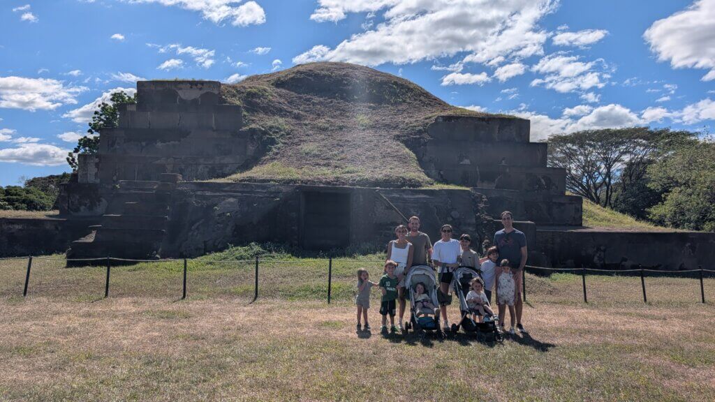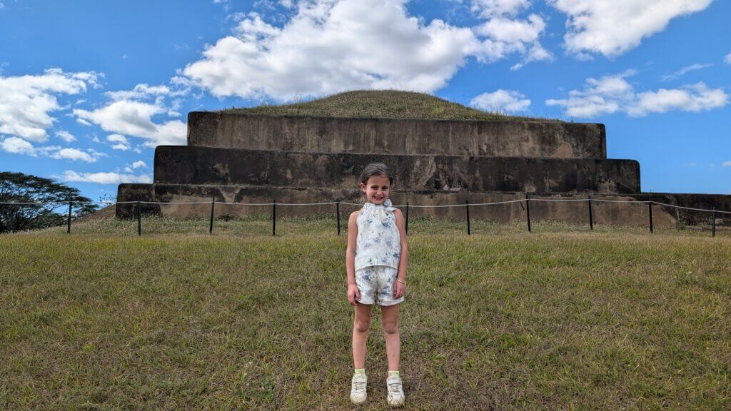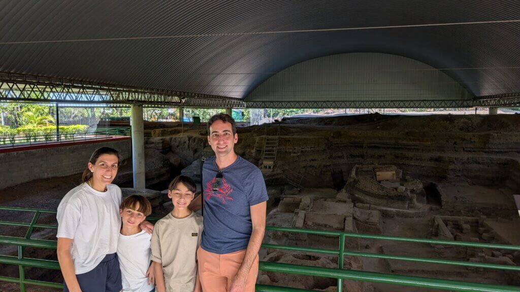 Our first stop was Parque Arqueológico Joya de Cerén – this particular site in El Salvador was unique and is sometimes called the “Pompeii of Central America.” Around 600 CE, the Loma Caldera volcano erupted, burying the surrounding land. Recently, archaeologists uncovered parts of the city and found the remains of government offices, homes with bedrooms and kitchens, and fields. We also saw an authentic temazcal (natural sauna) and how the roof was impacted by the volcanic eruption. Because everything was covered in volcanic ash, the level of detail preserved was amazing. It was fascinating to see how the corn and yucca plants were buried alive. Based on the corn harvest, it is believed that the eruption happened around August. Interestingly, no people were found, which may indicate that the town knew about the eruption and had time to run away. The site is a World Heritage Site and was very organized with a small museum exhibit and an English speaking guide who showed us around the ruins. Even the kids were interested- this was a great stop!!