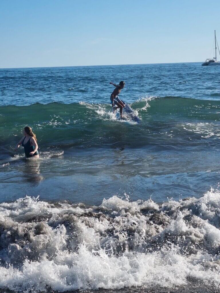 El Salvador is such a small country, yet you can experience such differences in elevations and scenery. El Tunco was hot and humid and felt nothing like the volcanic scenes in the mountains. We planned to spend the last part of the trip relaxing by the hotel, which was a beautiful resort and luxury for El Salvadoran standards. There were several pools to swim in and beach access a few minutes walk from the hotel. We wanted to check out the black sand beaches in El Zonte, the town over. We also were looking for natural caves that others had written about. We spent about 2 hours on the beach, mostly near the cave area. It is not a typical American beach with chair service and umbrellas. We dragged our stuff to a spot that looked comfortable and had fun swimming in the ocean for a bit of time. Eventually the waves got too rough and we headed back to El Tunco to relax by the pool. Sam, Zeke and the boys even attempted a surfing lesson, but the water was really quite wavy to be able to do it properly. We ended the night with dinner at Chabad.