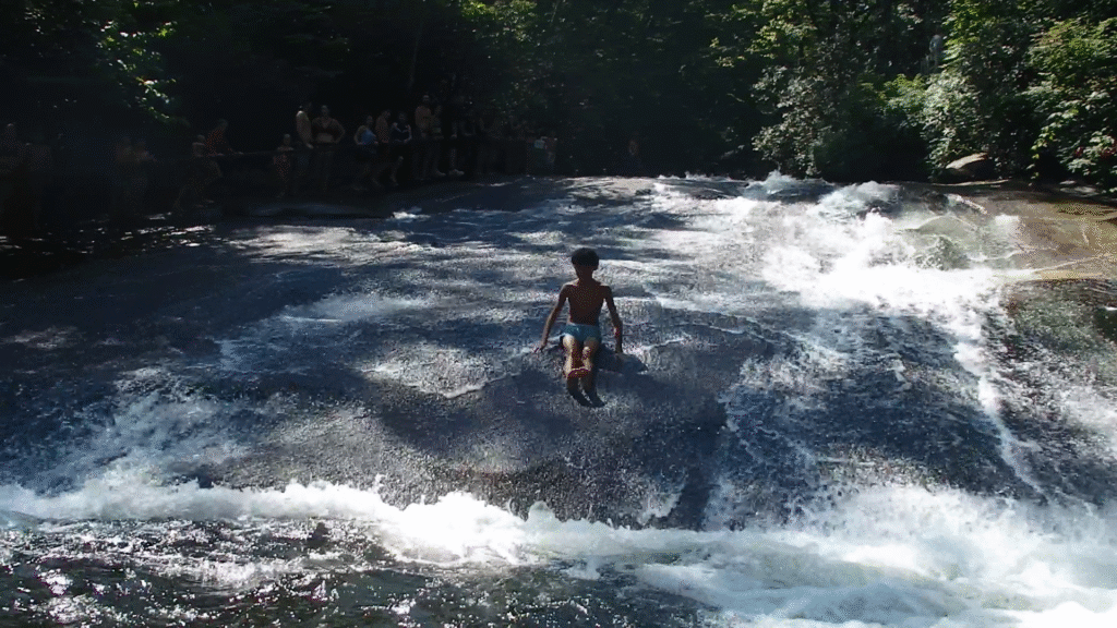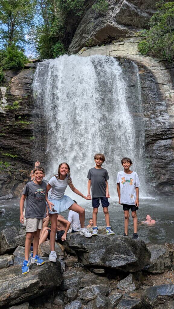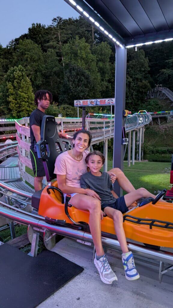Next we headed to Sliding Rock in Pisgah National Forest. Here we had fun sliding down the rocks on the natural water slide – even Sharon and Joshua went down and had fun splashing around. It was a nice way to cool down on the hot day. A few minutes drive away was Looking Glass Falls, where we saw a beautiful waterfall. We saw the pretty view above and then were able to walk down to get closer to it. Afterwards we started the 2.5 hour drive towards the hotel in Pigeon Forge. Once we got closer, we picked up our Walmart order for the week and made one last stop at Smoky Mountain Alpine Coaster. We had a blast on this super long Alpine Coaster built on the side of the mountain.