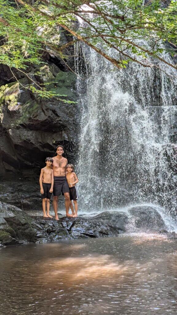 We then embarked on the Spruce Flats Falls hike in the park. It’s a 1.4 mile roundtrip trail with 460 feet elevation gain. Some kids took the lead and guided us ahead, while others needed some coaxing and holding. The hike was mostly shady in the forest and ends at a nice waterfall where we were able to wade in and get wet. We had a blast climbing the rocks, playing in the waterfall and splashing around. The boys caught a salamander and spent time examining it. Along the hike, the kids encountered many bugs, insects and spiders. They took pictures of their findings and searched online and in their guidebook to find what the animals were. It was very cute to see them get curious about their surroundings and use their resources to get answers. We were all wiped by the end of the hike, but we felt accomplished by what we had done.
