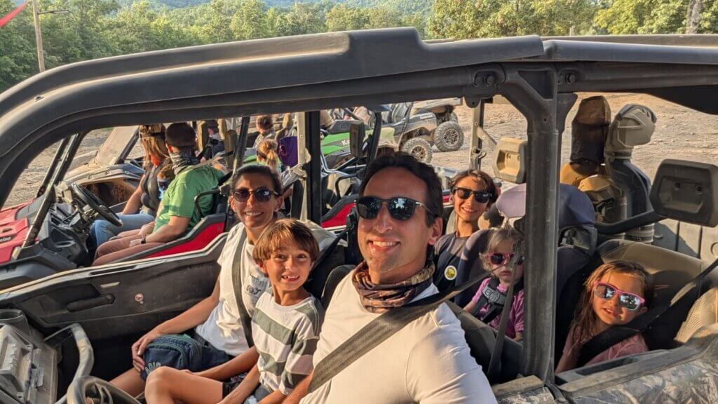 Our plan for the night was to do a UTV ride in the Smokies. We rented 3 UTVs (self driving off road vehicles) and had a blast driving through the rocky dusty terrain. The trip included a stop at the “million dollar view” of the Smokies. (This UTV activity made us realize how unique and amazing the UTV ride in Moab, UT really was because the kids tried to make this more thrilling by telling Sam to wait back and then speed ahead, but we got scolded by the guide.)