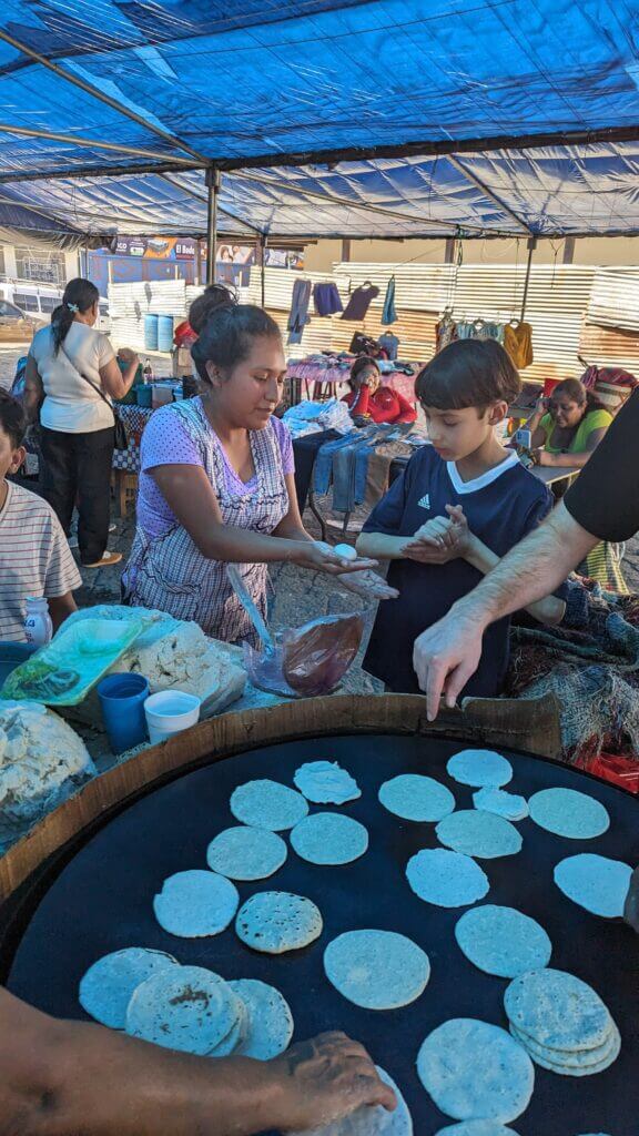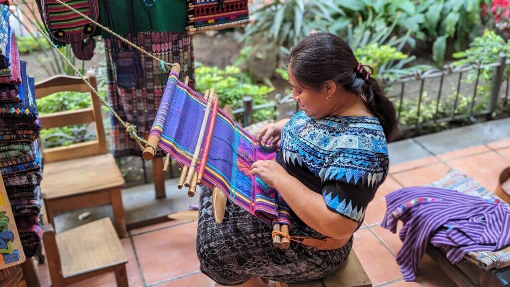 Santiago Atitlán – This town really gave us a feel for life of the ordinary Guatemalans. We saw tons of street vendors and women selling groceries. As usual, there were many stray dogs roaming the streets. Although Rita is still petrified of them, she definitely got more comfortable walking around the dogs. The green mango with salt and lime was delicious! The kids also enjoyed the orange mango. Zeke found a weaver who spoke Hebrew and made him Am Yisrael Chai pens – too bad that Zeke actually wanted bracelets, but more about that later. Santiago is the historical capital of the Tzutuhil Mayan people and we were able to learn about their culture here. We saw how the women wrapped her hair in a thread (to symbolize the Mayan snake) and ultimately created a headpiece out of it. We also stopped at a traditional worship house where they were worshiping by smoking, lighting candles, and burning incense. After a brief walk through town, we then headed back to the lancha to go to San Juan.