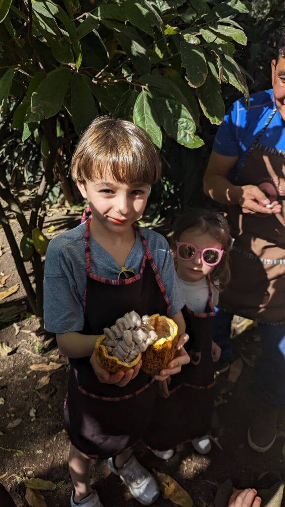Chocolate Making Class at Finca La Azotea – In the afternoon, we headed over to Finca La Azotea (Finca basically means estate or plantation). We did a chocolate making class, where we first made some molds out of already melted chocolate. Once we were done, we learned how chocolate is harvested from the Cacao tree as we opened up a fresh fruit and tasted it. We then learned how the beans are fermented, we roasted some, shelled them by hand, re-roasted the beans and ground them. It was a really cool and involved process that made us appreciate how much work goes into it.