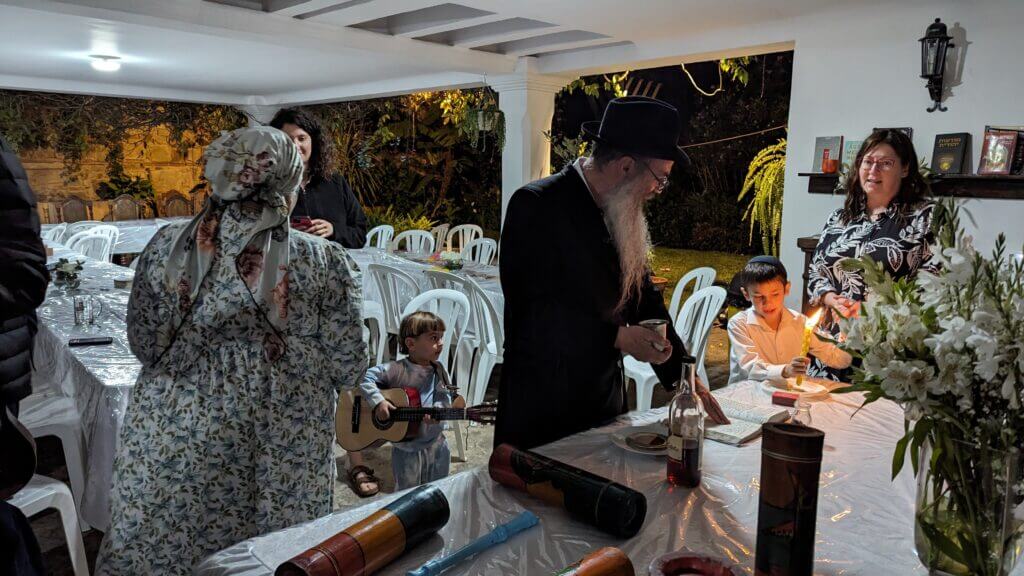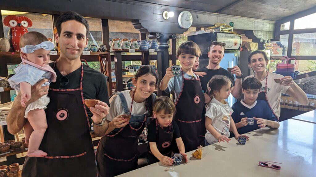 San Pedro La Laguna – We stopped at a nice lookout point and saw the entire harbor. We then walked around the village before getting to Chabad of San Pedro. We loved spotting random stores with Hebrew words and overhearing people speak Hebrew. For example, Joseph saw a dog coming near me and said “Don’t worry Mommy, it has a leash; it’s a nice dog. And the man walking with the dog says הוא צודק. The Chabad here had a very different vibe than Chabad Antigua. There were two restaurants here – a falafel / schnitzel stand and a dairy one. The Chabad house was smaller, but just as welcoming and friendly. We ate some dinner and ordered some food for the next day. Our lancha then met us at the dock and took us back to Pana around 6 PM. It was a full full day, but a very fun one!