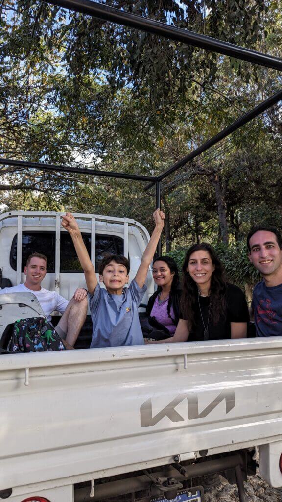 Cerro de la Cruz – Our journey began in a pickup truck. When Alejandro told us that we would be using a pickup truck, we really weren’t sure what to expect. Viviane sat in the car part with all the kids and the adults plus Allen sat in the back of the truck, exposed to the outdoors. Our first stop was at Cerra de la Cruz, which offered us gorgeous views of Antigua and the Agua Volcano.