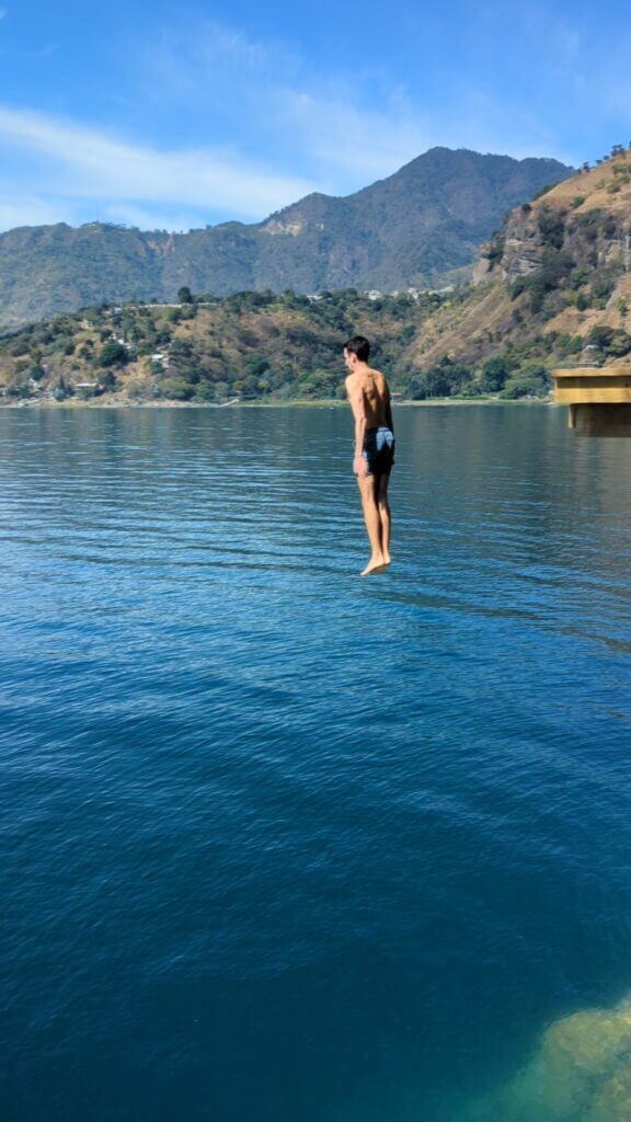San Marcos la Laguna – Sam read that this village had a cliff jump and insisted that we go there so that we could swim in the lake. After a short stop at a beautiful viewpoint, we made our way to the cliff. Once we were there, Sam hesitated a few times, but ultimately made the scary jump into the water. Zeke followed with a perfect form jump. It was thrilling and exhilarating and a small crowd gathered to watch. Afterwards we all swam for a little by the dock.