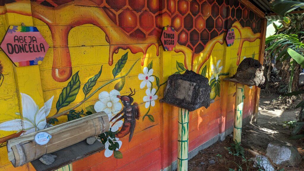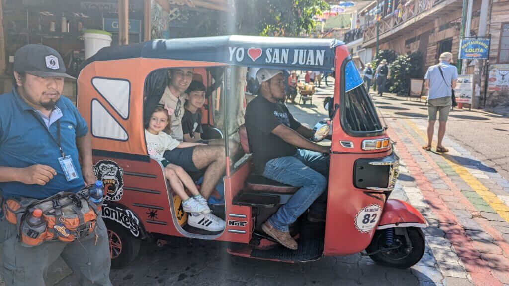 San Juan La Laguna – Our first tuk tuk experience! The tuk tuk is like a miniature taxi covered with a cloth roof with no doors and open sides. 3 people can fit in the back. The driver is in the middle of the front row with 2 potential spots on either side. We took the tuk tuk up to the top of the village and walked our way down. The first stop was a Mayan bee farm. Mayan bees are smaller than other bees and don’t have a stinger, although they can still bite. We looked at several different bee colonies and sampled some honey, including black honey. (BTW, these tours are all very quick, about 10-15 minutes, similar to the pueblitos in Antigua.) Next, Gespard taught us how they make coffee. We sampled the coffee plant fruit, which is actually sweet and juicy. The coffee plant gets picked 3 times a season once they are ripe. Once picked, the red beans are separated from the green ones. The bean gets removed, dried out and eventually ground into coffee. We continued our visit by walking through the artist’s colony, which has many giant murals and art installations. Next we visited the Mayan women’s cooperative, where we got a demonstration on how the women turn cotton into different types of clothing. We learned that they use different plants, fruits, and natural ingredients to dye the white cotton many colors. All of these demonstrations made us appreciate how much time and effort goes into the work of making food and clothing. We then hopped into another tuk tuk and headed to San Pedro, a village connected to San Juan. (Every time we saw a tuk tuk, all the kids shouted “tuk tuk.” They really were exposed to a very new and different culture.)