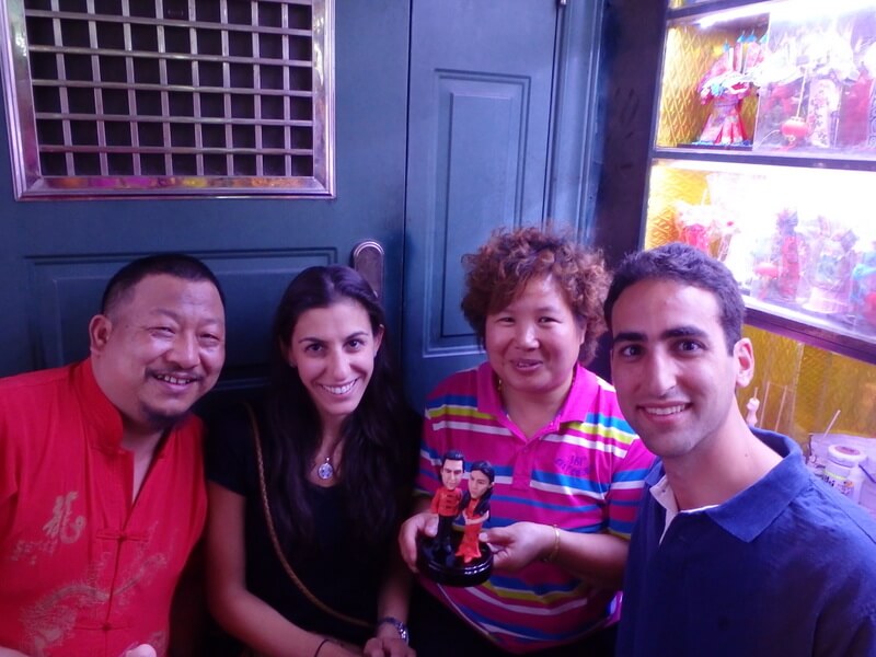 After an overnight 14-hour flight, we landed in Beijing. The first thing we noticed was a heavy haze that was over the city. We checked into the Grand Hyatt and got upgraded to a suite. The hotel was beautiful and was hosting a conference with Germany, so Angela Merkel was staying there. We went for dinner at Gong de Lin (vegan) where we ordered off a menu based on pictures. That night we visited Wangfujing night market, were we saw food vendors selling fried scorpions, chickens and smokey drinks. We found artists that sculpted clay figurines with our faces.