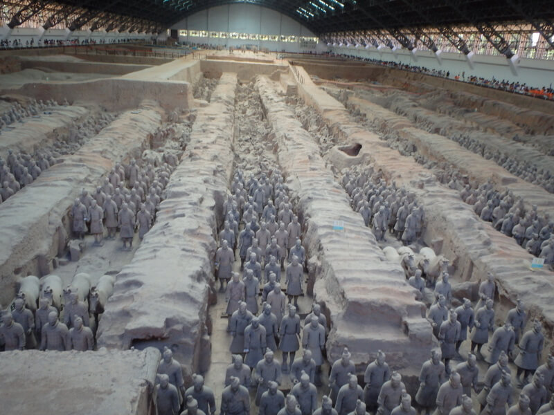 Emperor Qin’s Mausoleum / Terra Cotta Warriors – The Qin dynasty (250 BCE) was Imperial China’s first, but it lasted less than 30 years. Qin (Emperor Shi Huangdi) took over at the age of 22 and united several lands by the age of 39. He began construction on his tomb at the age of 13, and used 700k people to build an army out of terra cotta. Historians left it untouched mostly, 1) to preserve it, 2) because it’s laced in radioactive mercury to keep out vandals, and 3) to get you to come back. The warriors are not all the same, and are modeled after people from all over China. (They were killed once the statues were completed.) The Mausoleum was discovered by farmers who were digging for wells in the area in 1974. There are 3 pits to visit, with thousands of soldiers, horses and chariots. One of the farmers who discovered it was there signing autographs.