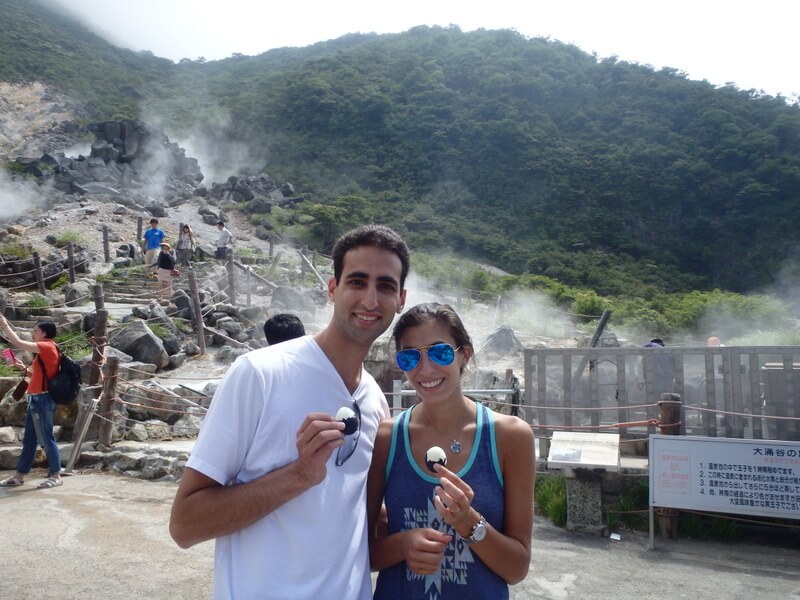 Owakudani – At the top of the ropeway, we walked by the volcano. The hot spring waters there have sulfur and they boil eggs in the water that turns the shell black. We ate 5 black eggs, which were extremely hot.