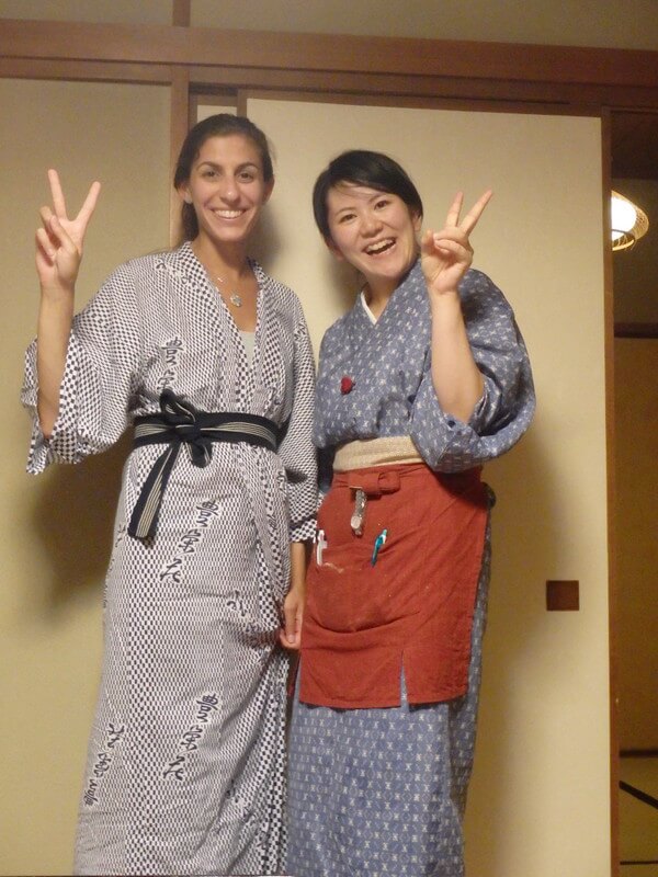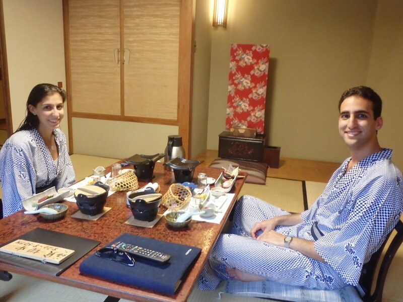 Heoiso Ryokan – That evening, we finally got to our Ryokan. It had a really zen atmosphere, and we took off our shoes and put on slippers to go inside. We had one section in the room for eating and sleeping. Before dinner, we took a dip in the onsen. After changing into robes in the room, we went separately into the men’s and women’s onsen. After washing off, we took a dip in the hot pools.