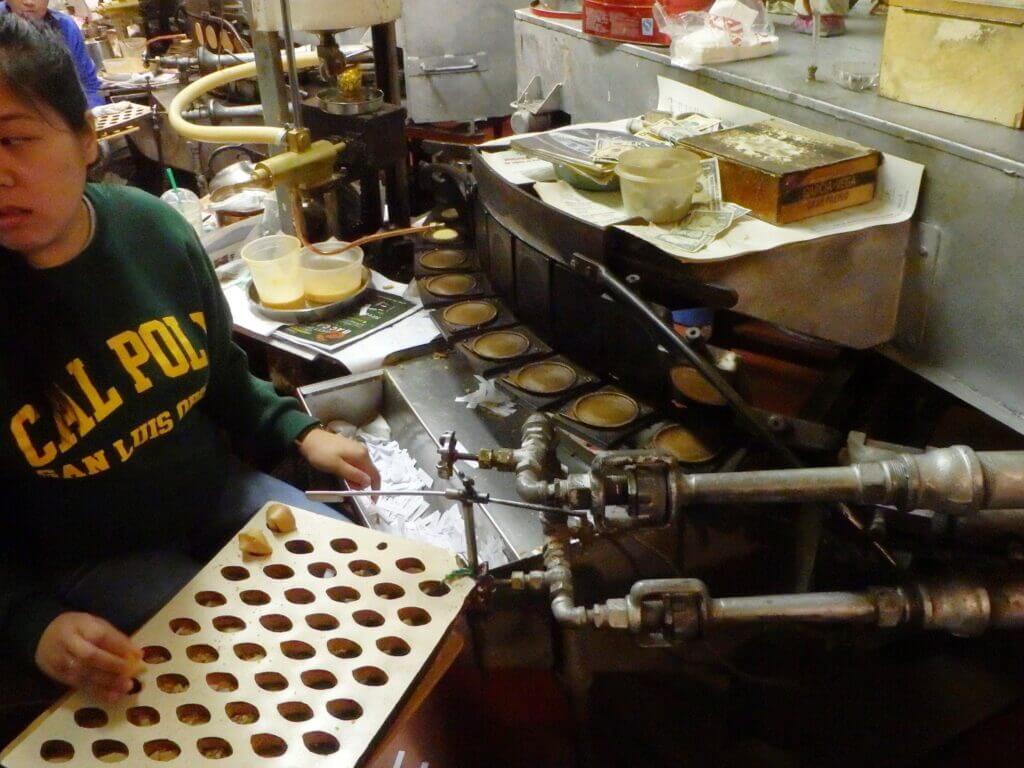 Golden Gate Fortune Cookies – In Chinatown, we visited one of the shops that make fortune cookies. These round pieces of dough come out of the machine and someone puts in the fortune and folds the cookie over it.