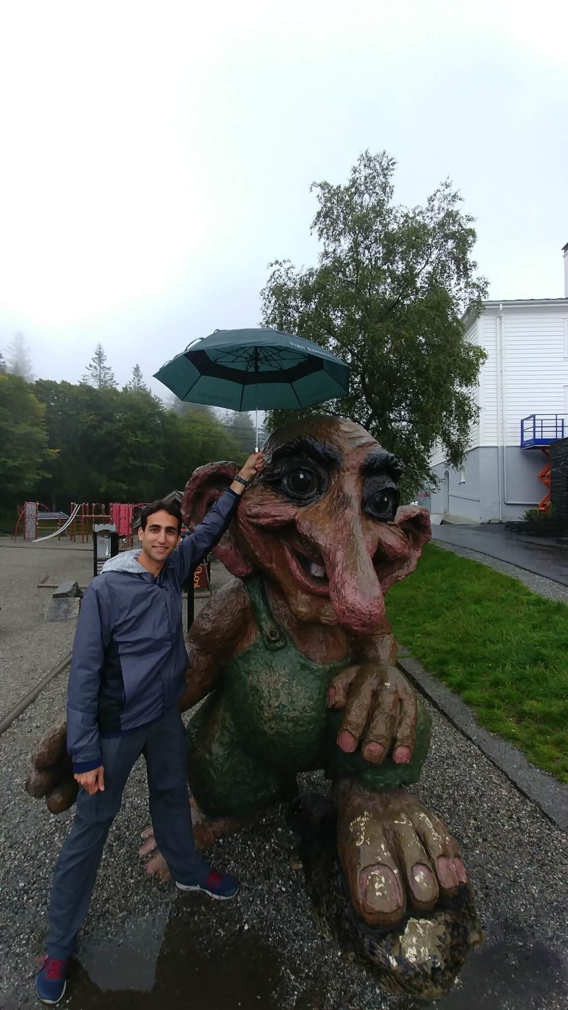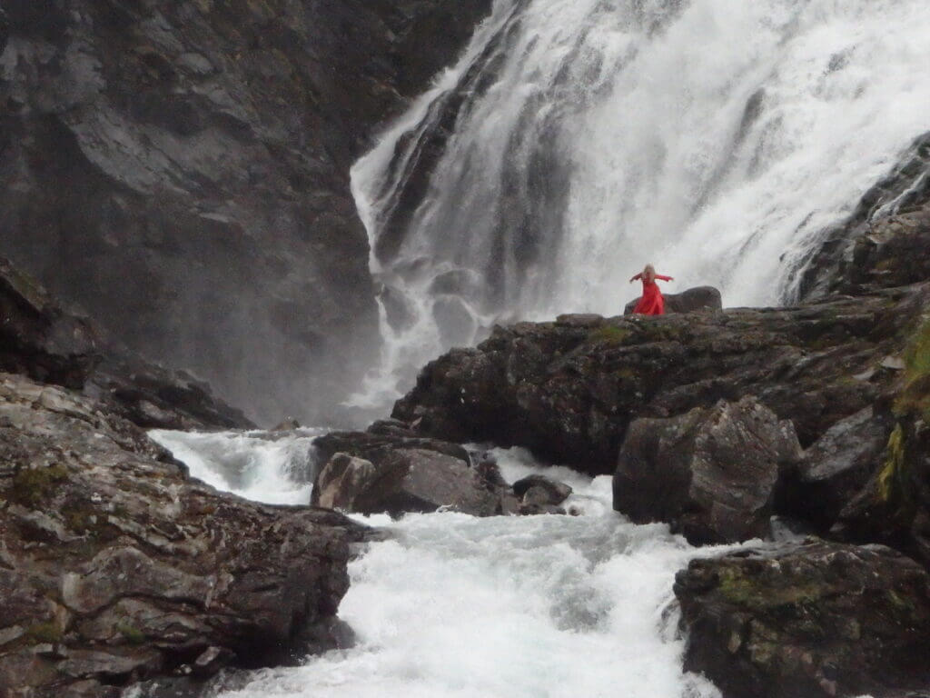 Flamsbana – The next morning, we woke up at our hotel and got right on the Flam Railway. We didn’t have to hike back to Myrdal, as Vatnahausen was the second stop along the railway to Flam. This part of the route had us riding in beautiful antique railcars through the valleys and hills. At one point, the train stopped by a waterfall for everyone to get out and see the waterfall. At the Kjosfossen waterfall, we even spotted Huldra, an elusive forest spirit who, according to local folklore, lures men into the woods to seduce them. Thankfully we made it through!