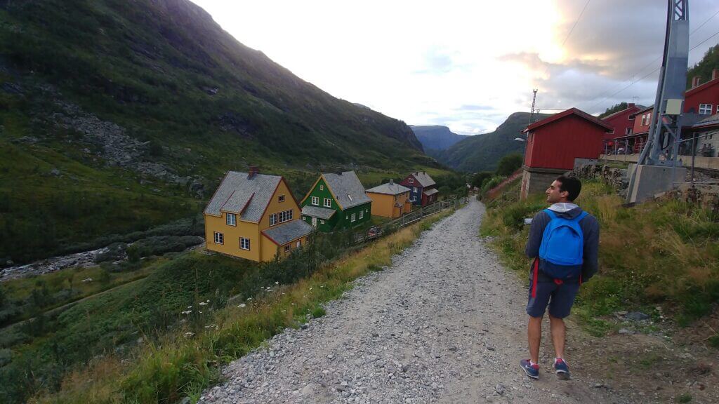 Norway in a Nutshell – This the name given to a popular travel route that allows people to experience the Norwegian Fjords. You can book it all on one ticket, or buy the tickets yourself (which we did). The trip consists of a train ride to Myrdal, a historic train to the port town of Flam, then a boat ride through the Fjords, and a bus and train to the city of Bergen. Logistics here took a bit of figuring out. We decided to leave late afternoon, and spend a night along the route to give us more time to enjoy the area. We found a hotel in Vatnahausen, which was at the beginning of the Flam Railway part of the journey. We arranged for a porter service to ship our luggage from Oslo to Bergen directly and just packed a backpack for the night (like we did in Hakone, Japan) Once we got off the train in Myrdal, we had to hike on our own from the train 20 minutes / 1.5 km along the mountainside to Vatnahausen. We were worried we wouldn’t be able to find it, but the route was very easy and it was beautiful walking along the stream in the quiet countryside around sunset.