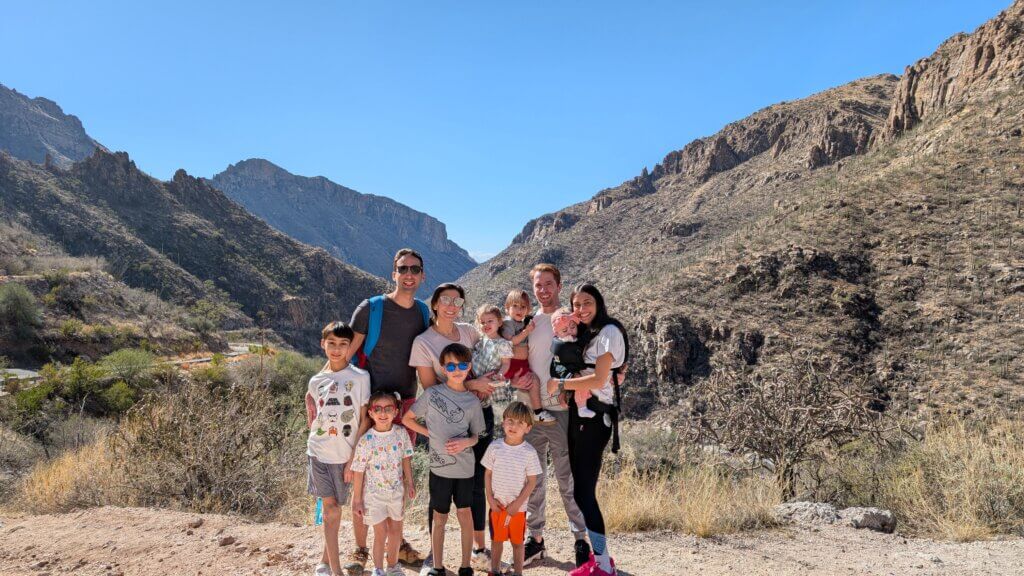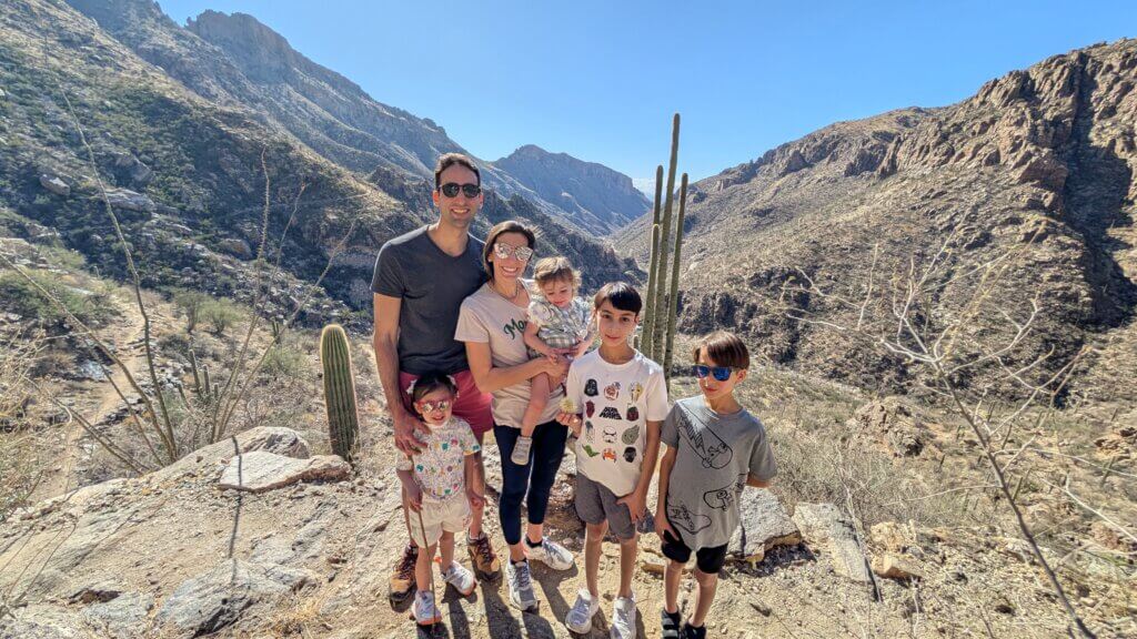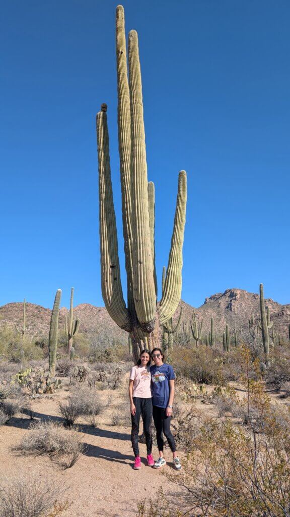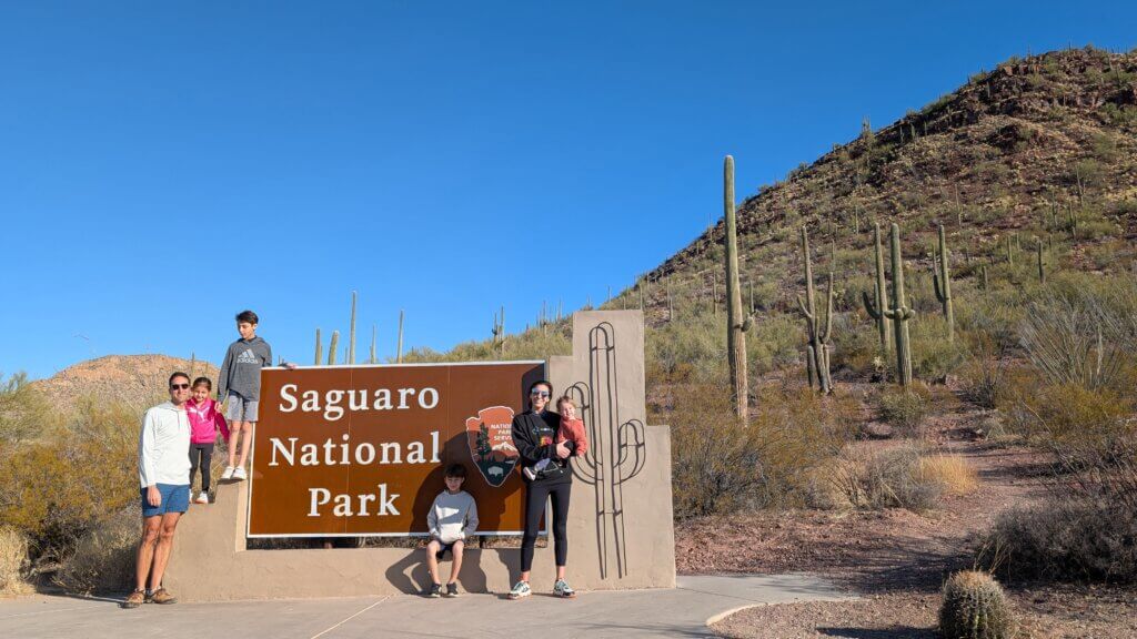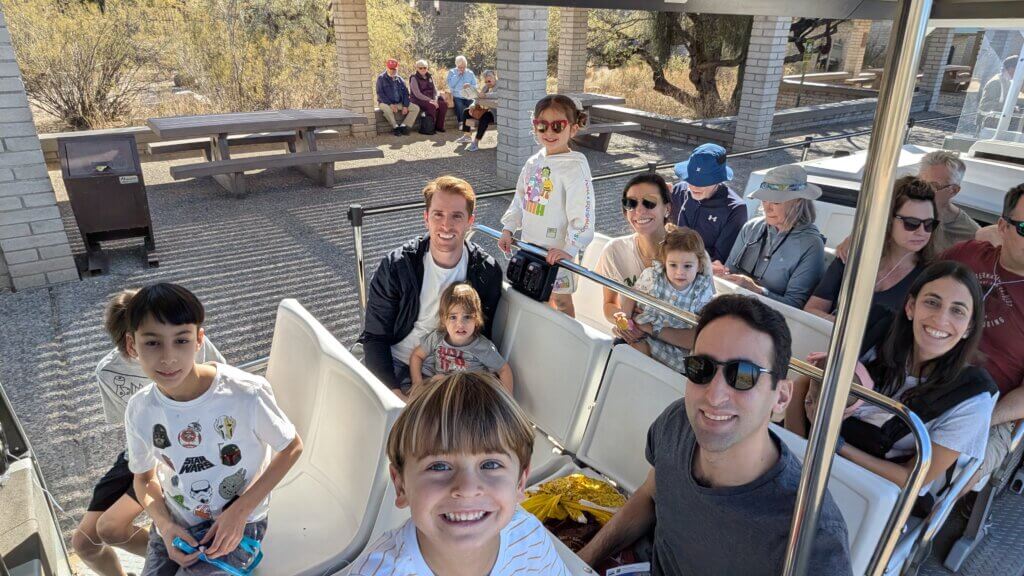 After a late landing in Phoenix, we stayed at the nearby airport hotel for the night. In the morning, we drove about 2 hours to Sabino Canyon. When we visited in 2022, we tried to come here, but the shuttles were fully booked, so we made sure to book it in advance for this trip. We took the Sabino Canyon shuttle, which is about a 30 minute journey to the top. Once we reached the destination, we chose to get off and hike for about a mile. We saw beautiful desert scenery of saguaro, prickly pear, and cholla cacti. Sharon was our newest hiking champion, crying whenever she wasn’t allowed to walk herself. Allen and Joseph enjoyed running ahead and Shelly and Steven had a blast hiking together. Joanne was thrilled to be carried in her mom’s arms. After the hike, we took the (very crowded) shuttle back down. On the way down, the shuttle makes 8 stops where it drops off or picks up passengers. We ended our visit with the short Bajada Loop Nature trail, where we saw a rare crested saguaro. This park was very nice, but would have been spectacular had there been any water in the streams/pools. Fun fact: saguaros don’t grow arms until they are about 75 years old!