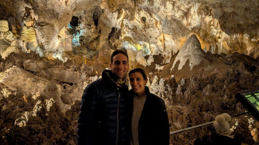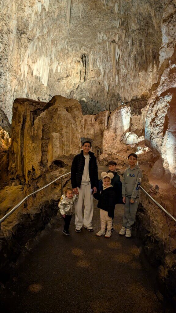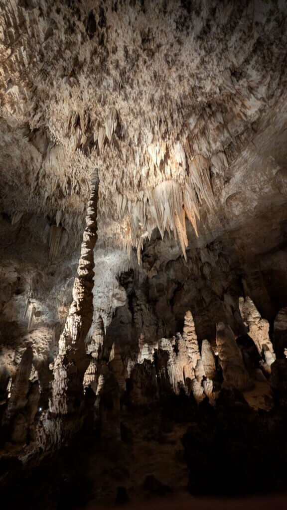Afterwards, we went down the elevator 750 feet to the Carlsbad Caverns. It was interesting that everything was pretty much self guided – the rangers didn’t even take you down the elevator and once we got down, we were free to walk around by ourselves. We did the Big Room Trail, a 1.25 mile paved walkway along the beautiful cave. Sharon was having a great time walking the paved, mostly flat path. We were all enthralled by the cool rock formations – stalagmites, stalactites, soda straws, popcorn, etc. etc. it’s amazing what a bit of water and a lot of time can create!! It felt like a surreal experience. We spent a little more than an hour exploring underground. Although we anticipated doing the shortcut, once we were there and saw that everyone was engaged in the activity, we decided to do the entire loop. We really enjoyed this experience!! This was a great, child friendly activity. The one regret is that we didn’t get to see all the bats fly out at sunset because they are currently hibernating for the winter!