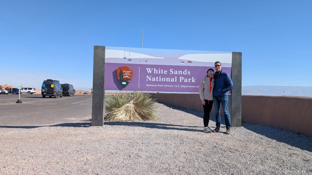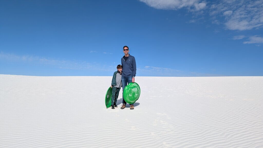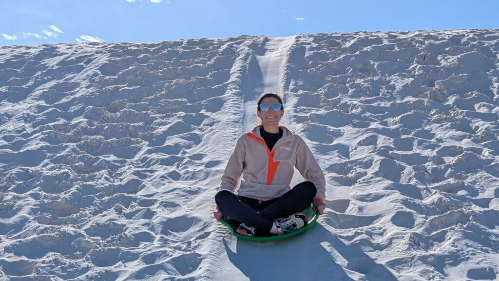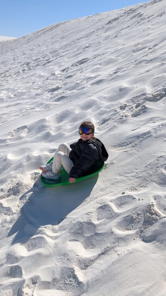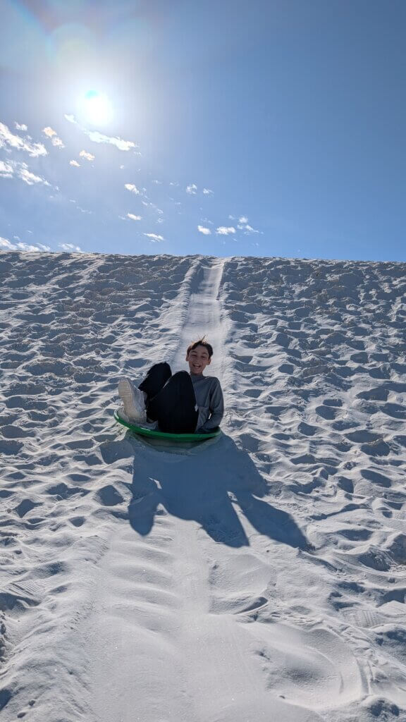 Next up was the main attraction of the trip – White Sands National Park! This was a bucket list item and something that we’ve been wanting to do for a while! The park has enormous dunes of white sand, really gypsum, that is soft and fun for sledding. It took us a few attempts to figure out the best way to get a great sledding experience. Look for a steep hill, wax the sled, and go down the same path several times to create a smooth line. Better yet- find a path that someone already created and go down it. We had a blast climbing up the soft sand and sledding down. Despite the 40 degree temperatures, we were very comfortable and even hot at times. There was no wind, which made it a very pleasant experience. We spent about 3 hours sledding, driving around the park, taking in the scenery and taking pictures. We originally wanted to walk the Interdune Boardwalk Trail, but it was closed due to a mishap from the Air Force base nearby. (New Mexico was (is?) a testing site for the Air Force. Although a bit anticlimactic at first, once we got into a groove, we really enjoyed our time at White Sands National Park. Some notes – you can drive right to up to many of the dunes, park the car and get right out to sled. We did this in a few spots around the park. You can also walk further if you want to get to a more pristine spot. The gift shop at the park was only eh so it may be worthwhile to look for souvenirs in Alamogordo.