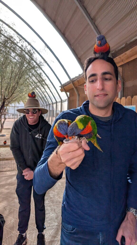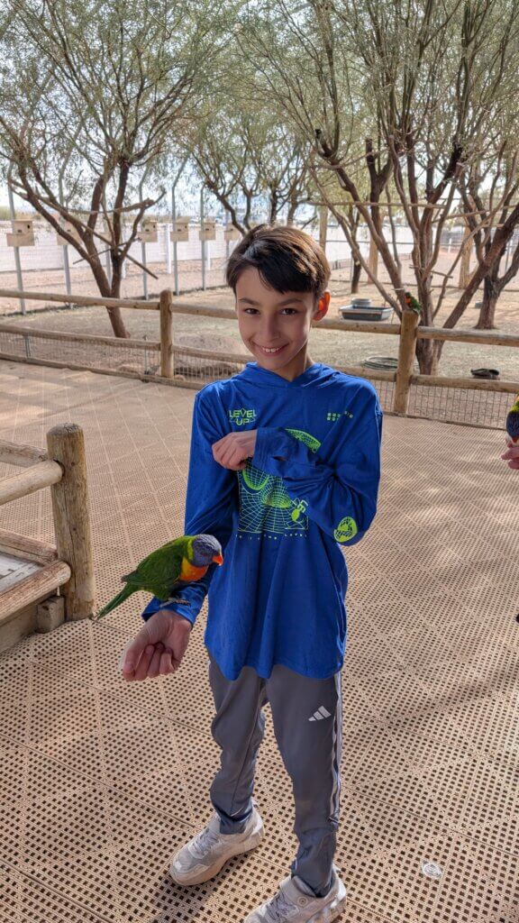 Since we readjusted our plans and spent the night in Tucson, we ended up piling another audible and changing Wednesday’s plan too. We started the day at Rooster Cogburn Ostrich Ranch, which was a really cool experience for everyone. We fed 12 different and unique animals, including ostrich, lorikeets, giant tortoises and donkeys. Rita, Sam and Allen even kissed a goat!! The lorikeet was able to open the container of nectar and suck it by herself. It was a fun activity and highly recommended!