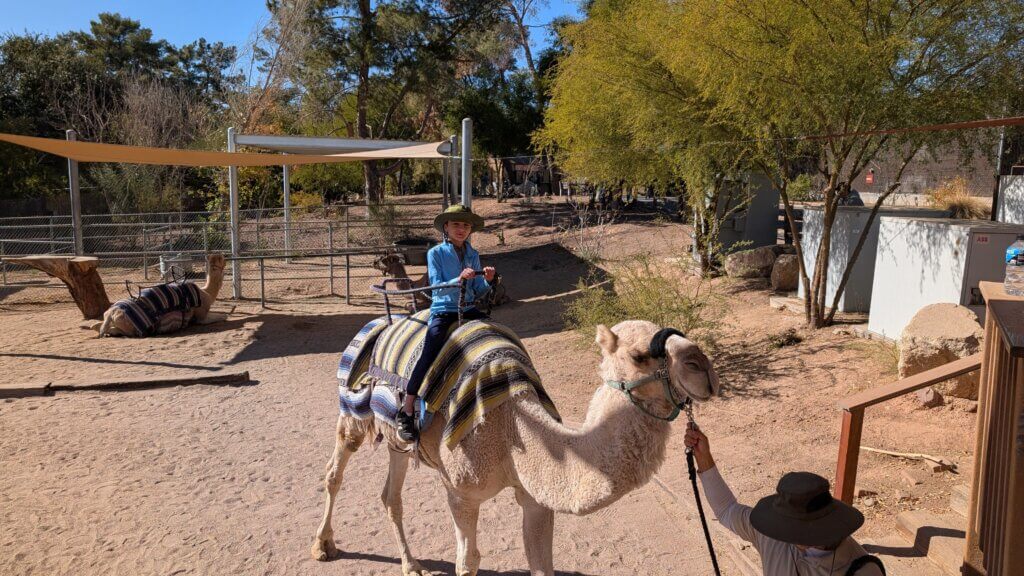 We started at Hole in the Rock in Papago Park, a very very short hike and climb to a literal hole in the rock. Shelly cried the entire time but Sharon had a blast. It was a beautiful view but the wind made it uncomfortable. We debated what to do afterwards and ultimately ended up at the Phoenix Zoo. The animals were very lively and we enjoyed some of the unique experiences, including the camel ride and money village. We also laughed watching the apes / chimps play hide and seek with the kids. After a few hours, the Dweks headed back to the hotel to relax, but the Francos needed more action. The wind has calmed down enough that we decided to go to Goldfield Ghost Town to ride the Superstition Zipline. Since Utah, Joseph has been wanting to do a zipline and we finally had the opportunity to do it. It was a tandem Zipline chair, pulling you back and then releasing you forward. Afterwards, we were able to sneak in a 30 minute horseback riding session through the desert for Sam and the boys in a nearby corral, while Rita stayed in the town with the girls. We took a train ride around the village and enjoyed Prickly Pear lemonade. We ended the night off enjoying dinner with the Dweks.